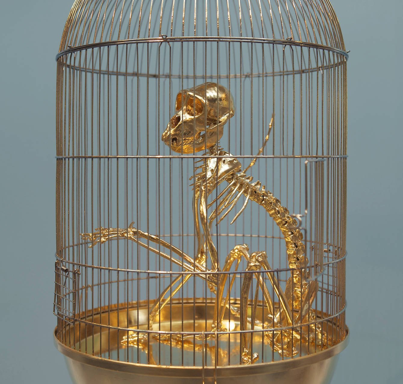The Flim Flam is a real monkey skeleton. It’s gilded with 24-karat gold leaf in a birdcage. The formats: 40 cm diameter x 70 cm height